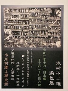 もうひとつは、2019年以来2回目となる 小川村郷土歴史館での木村不二雄 染色展です。会期は、2025年10月3日(金)から10月27日(月)9時30分~16時30分 火曜定休 入場無料です。